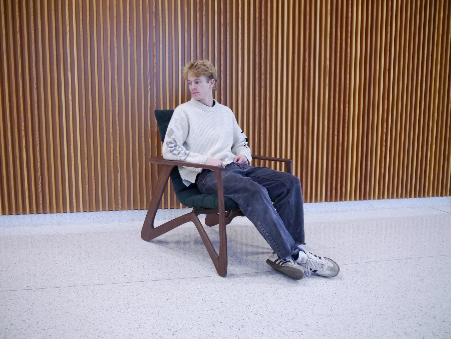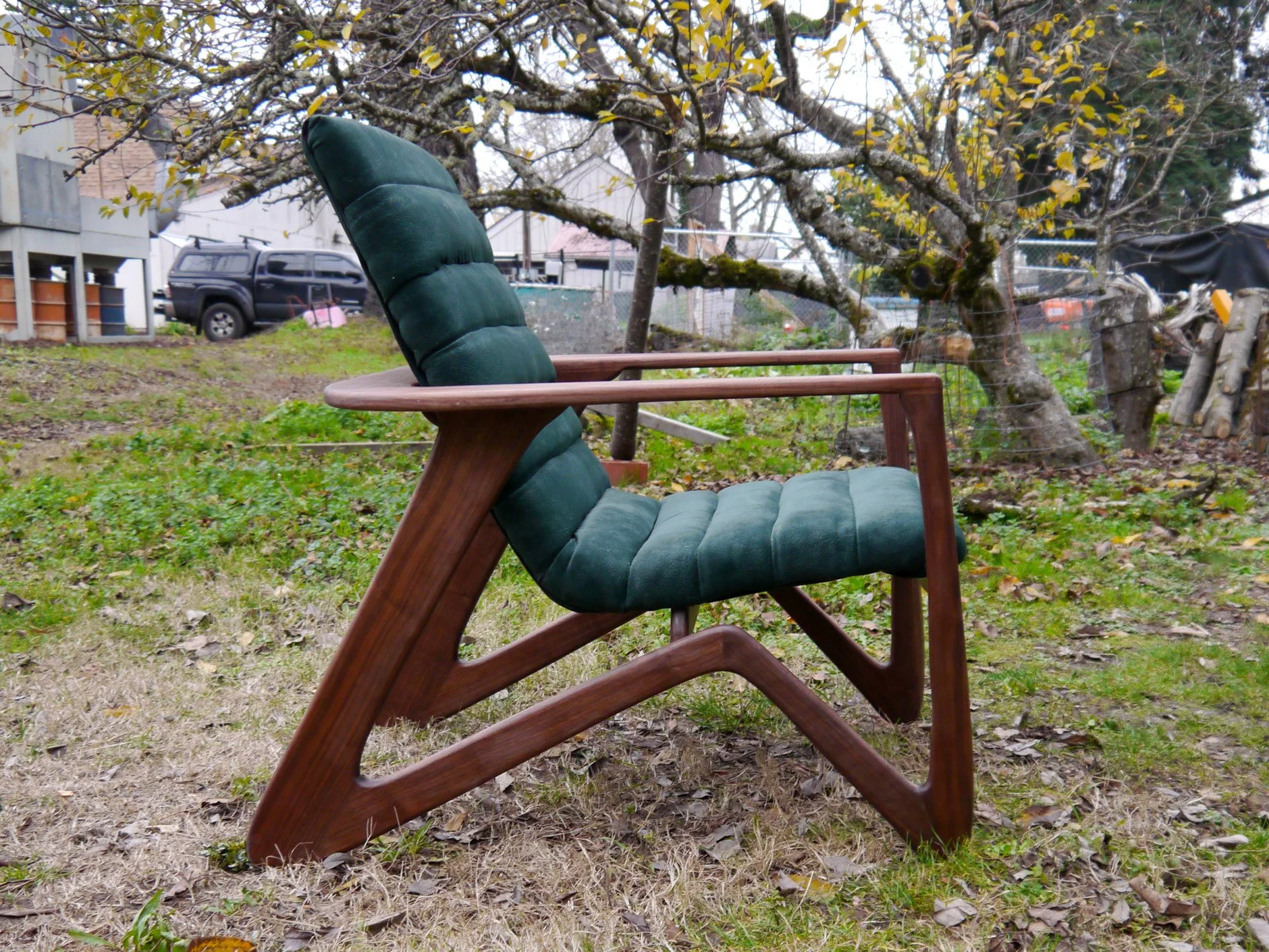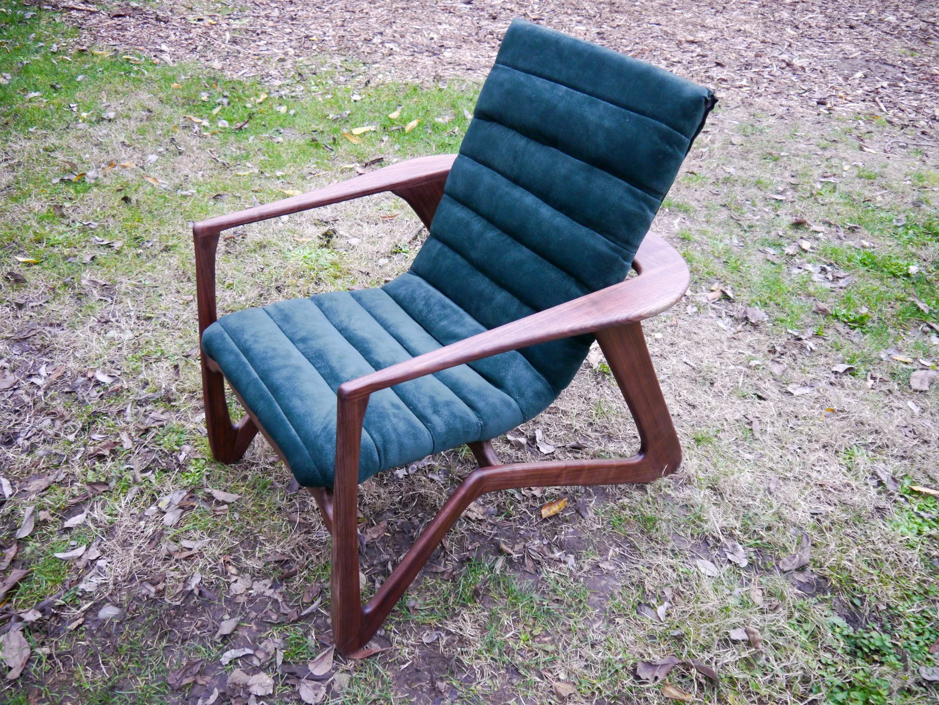 The Mantis Chair is a handcrafted lounge chair. Designed and built entirely by hand, the chair features a sculptural black walnut frame and a velvet upholstered seat. The custom seat frame is shaped using custom laser cut router templates giving the curvature shown. Cross beams and hidden bolts connect the seat, giving the illusion it is hovering above the main frame. A dark green velvet seat and backrest, upholstered by hand, provide cushion and comfort to the lounge chair. Designed using air-dried wood and vintage velvet from my grandparents give the Mantis Chair a timeless aesthetic.