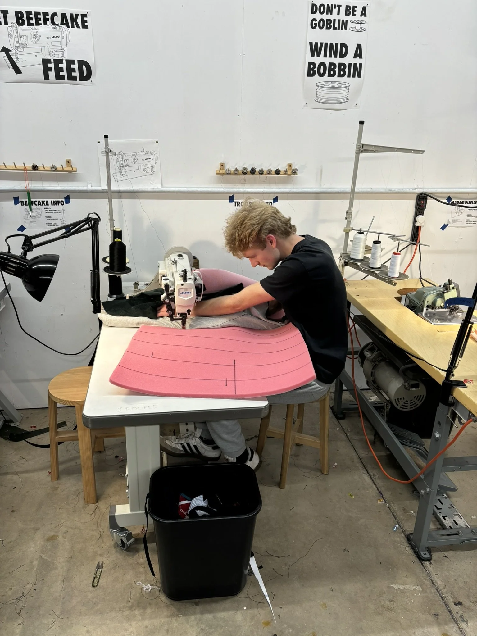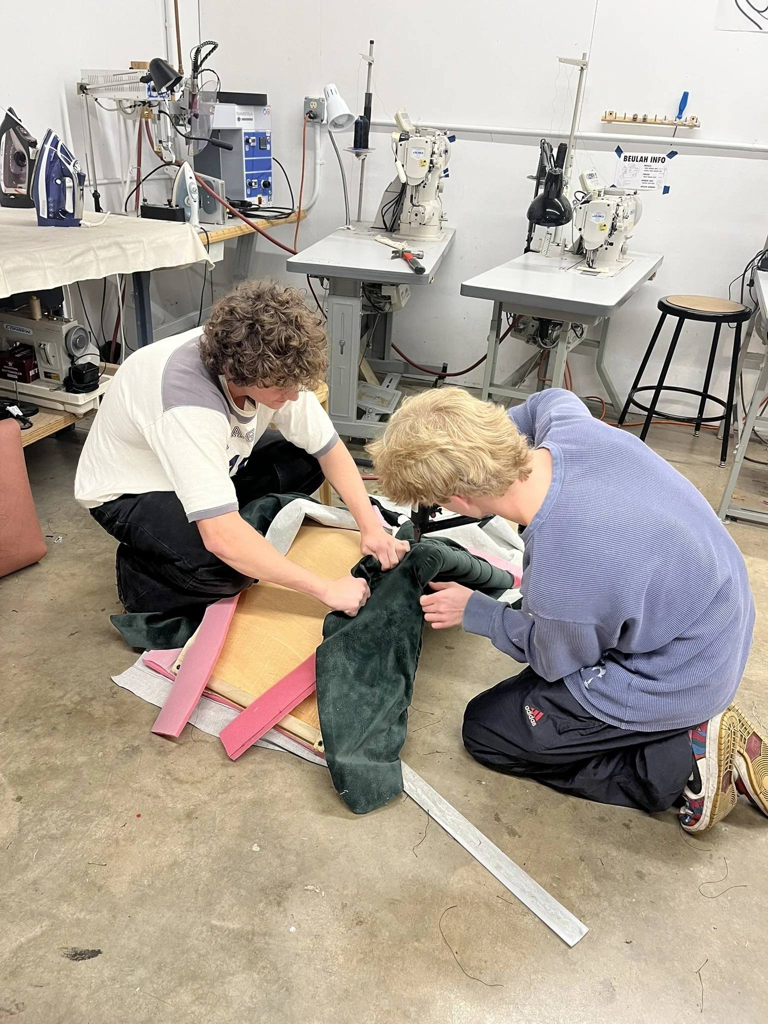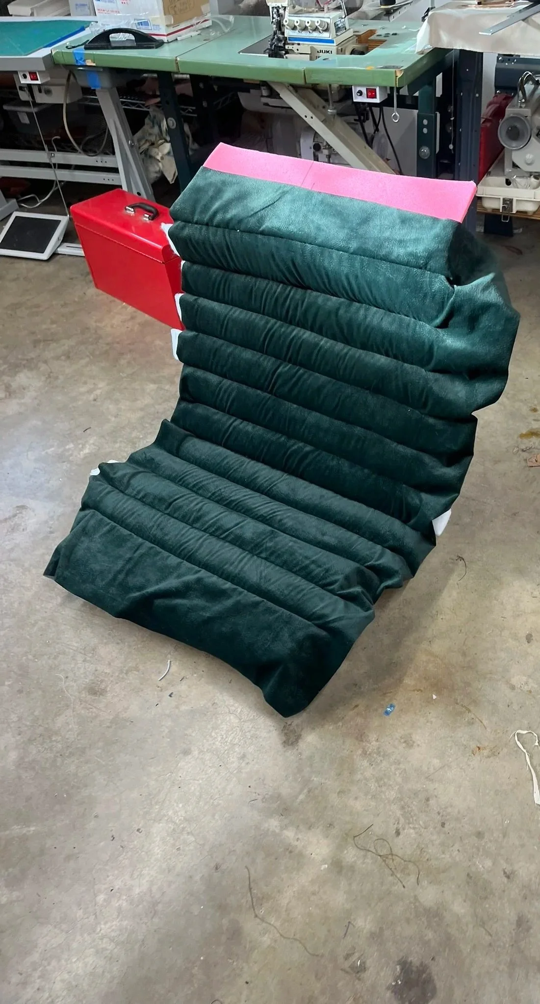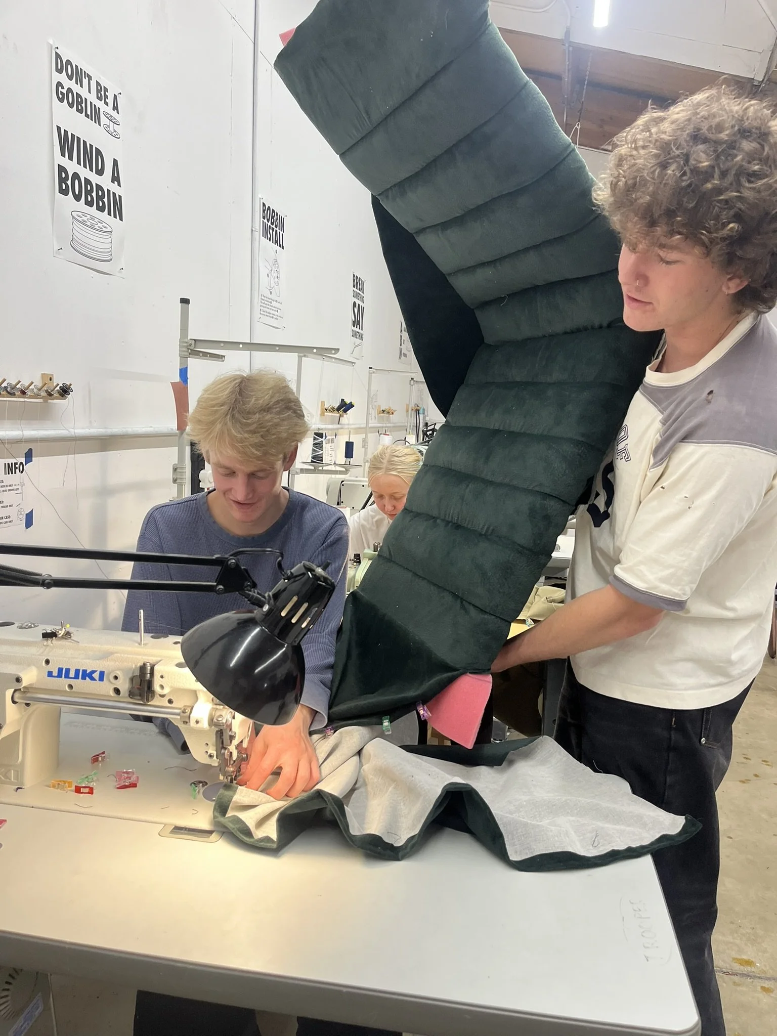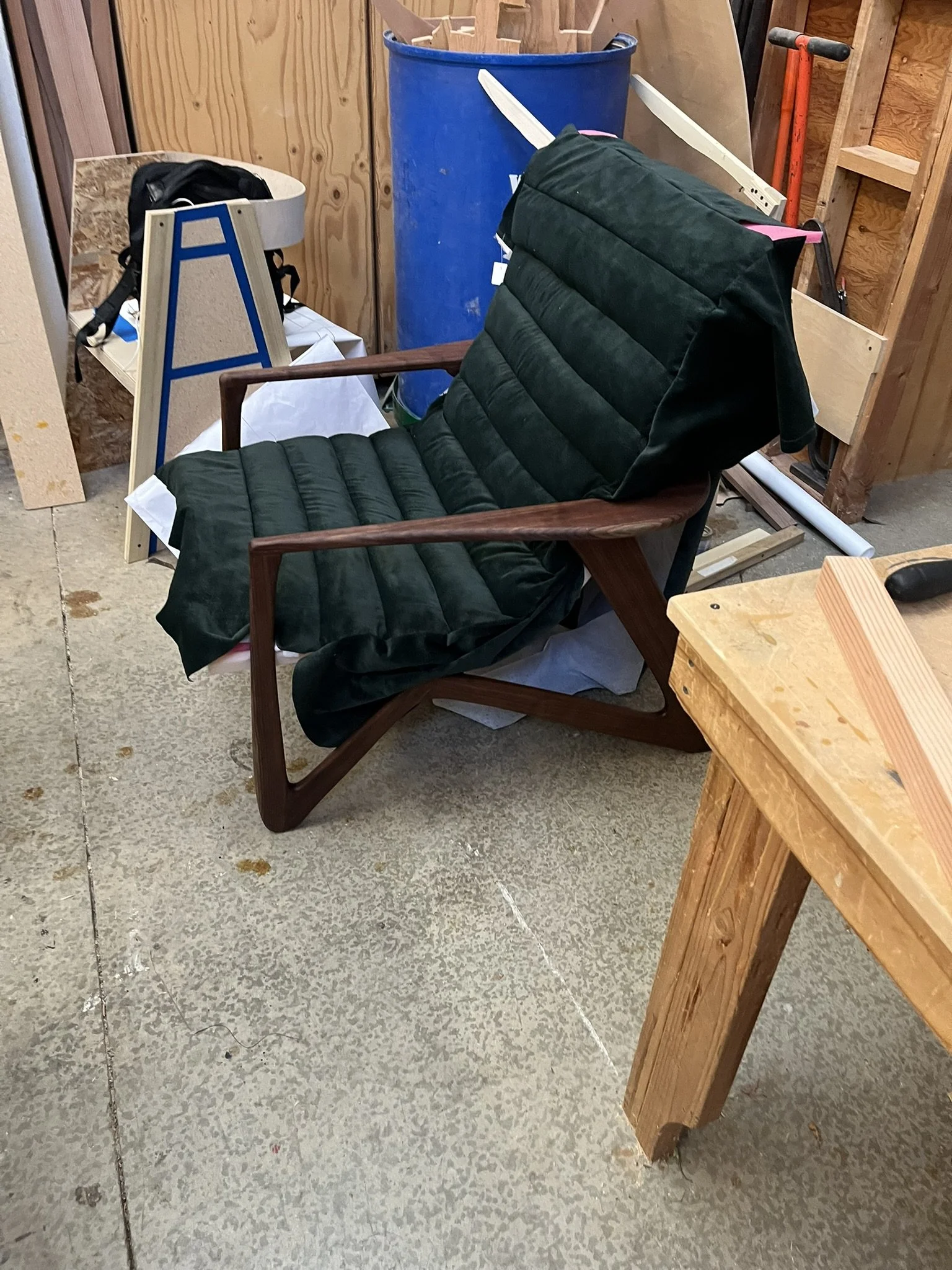 The final step to complete the Mantis chair was upholstery. The cushion is made from vintage dark green velvet stitched in lines on top of 1/2in scrim to create pockets. The pockets were stuffed with Dacron to give the chair the ribbed aesthetic and extra cushion. Finally, the fabric was stretched around the foam and stapled to the wooden seat frame to completely enclose and cover the seat.
