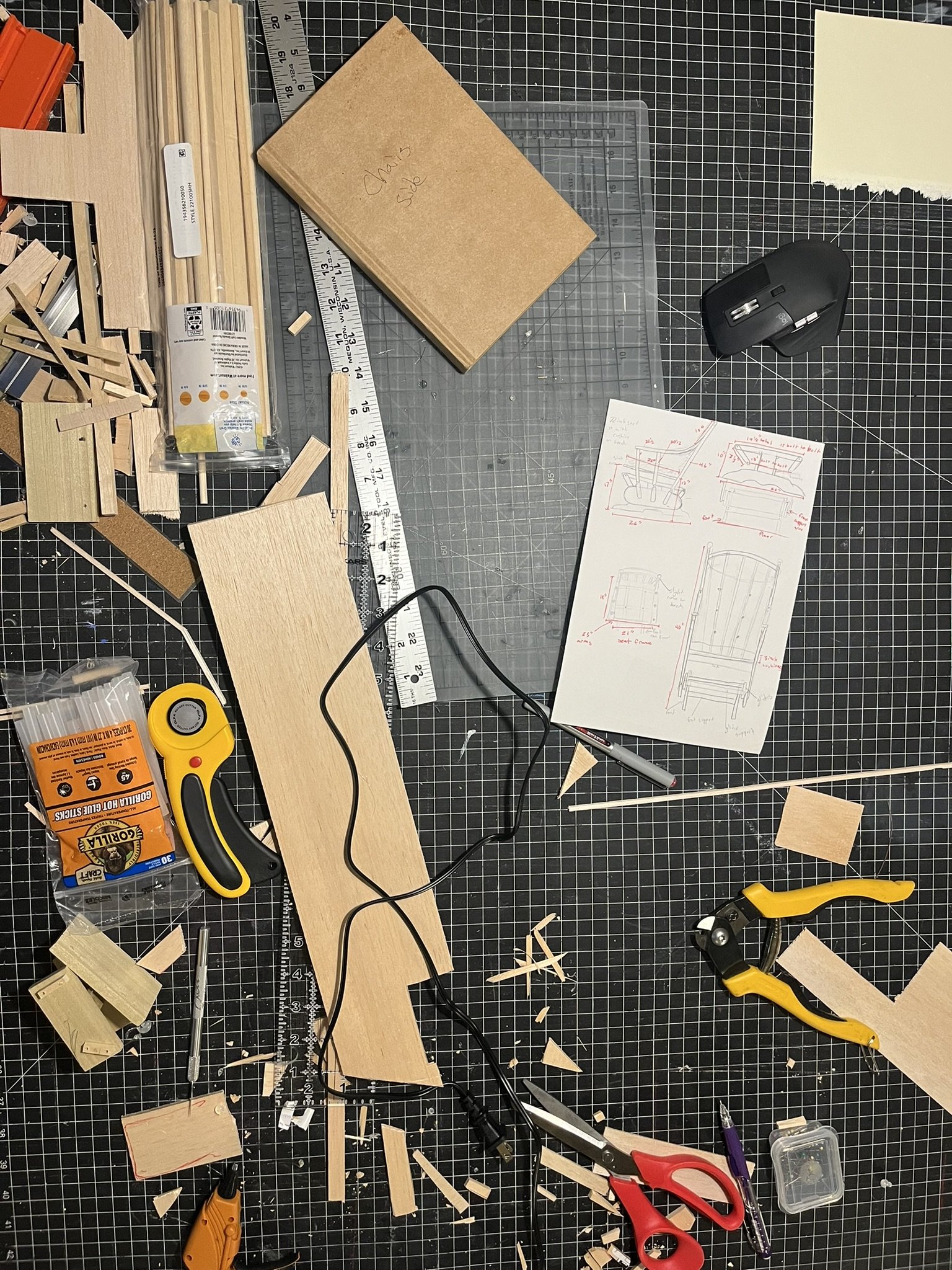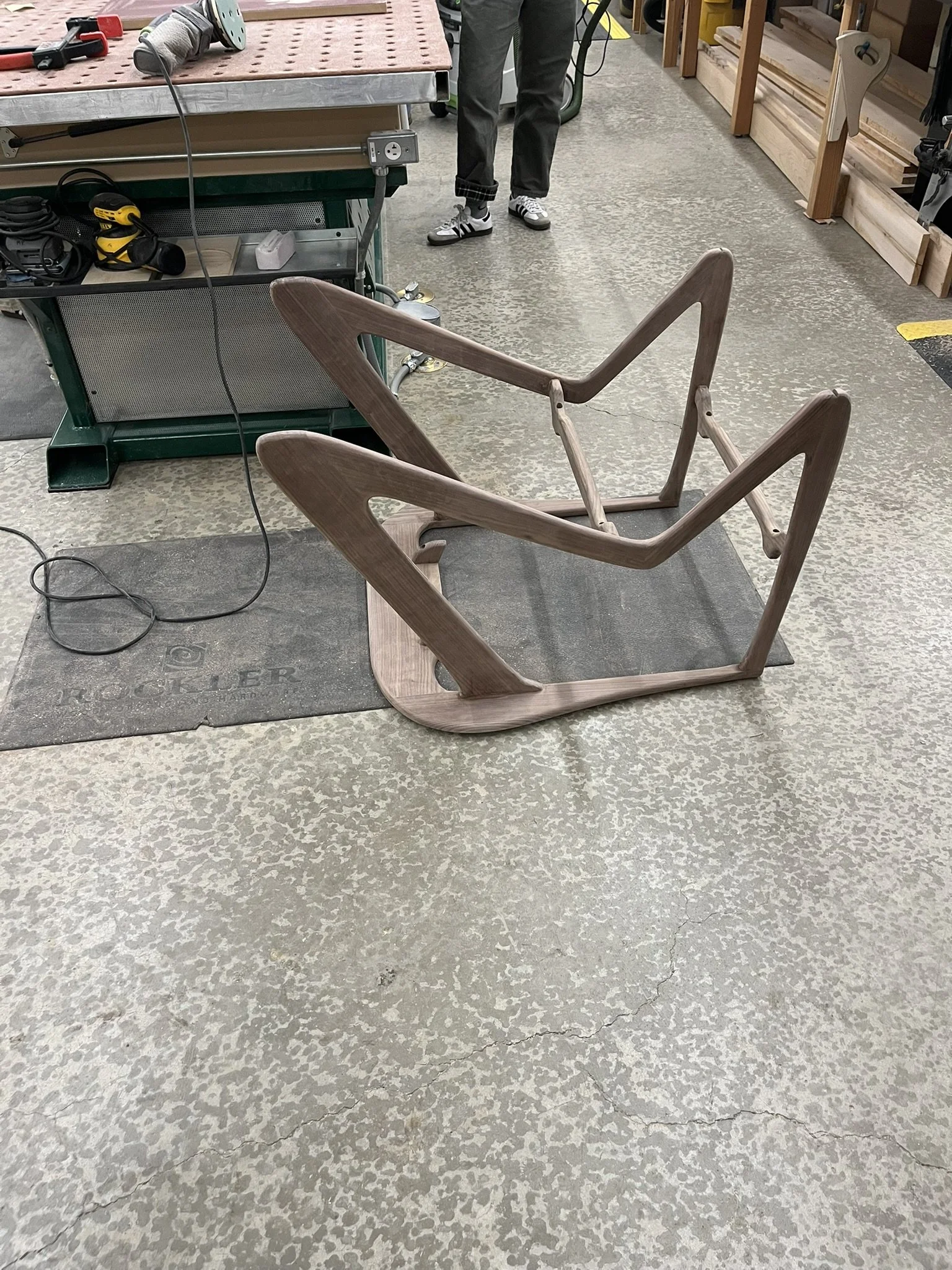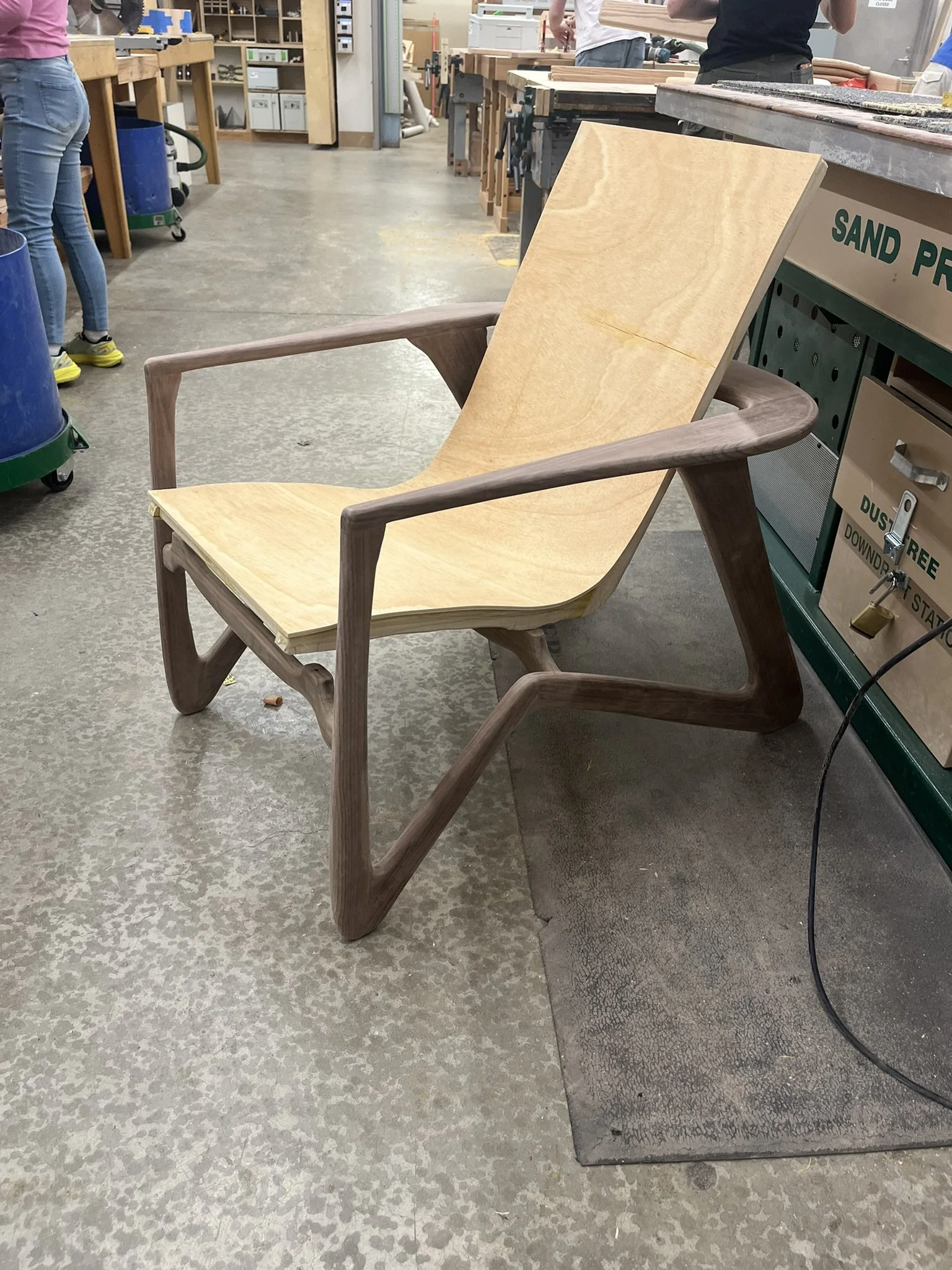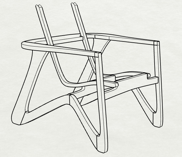 The Mantis chair was very inspired by mid-century modern wooden furniture. Starting with pencil sketches the idea developed. Once a form idea was developed, I researched dimensions and construction methods to actually make the chair. To see the form in 3-D small scale models were made. To test the seat angles and overall dimensions a 1 of 1 scale model was quickly constructed. After fine tuning the form, scale and ergonomic angles a 1 of 1 scale CAD model was made in Rhinoceros 3D. Finally, a 1/4 scale model was constructed out of walnut scraps to better see the final dimensions and aesthetic. The Rhino file also finalized the curvature of the frame to allow for laser cut router templates made of MDF.