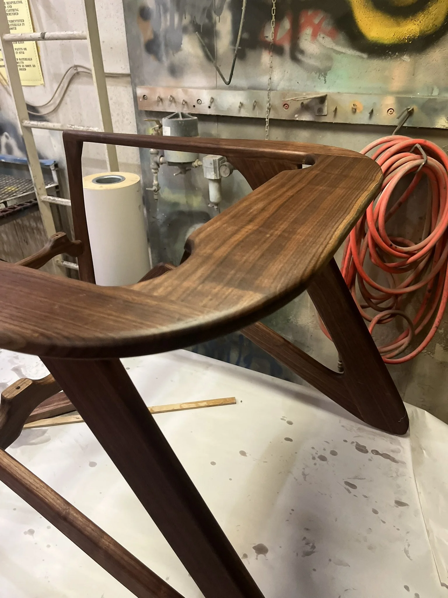 The Mantis chair was finished using Osmo Clear Satin oil. This finish was easy to apply, protects the chair and pops the dark color and beautiful grain of the black walnut