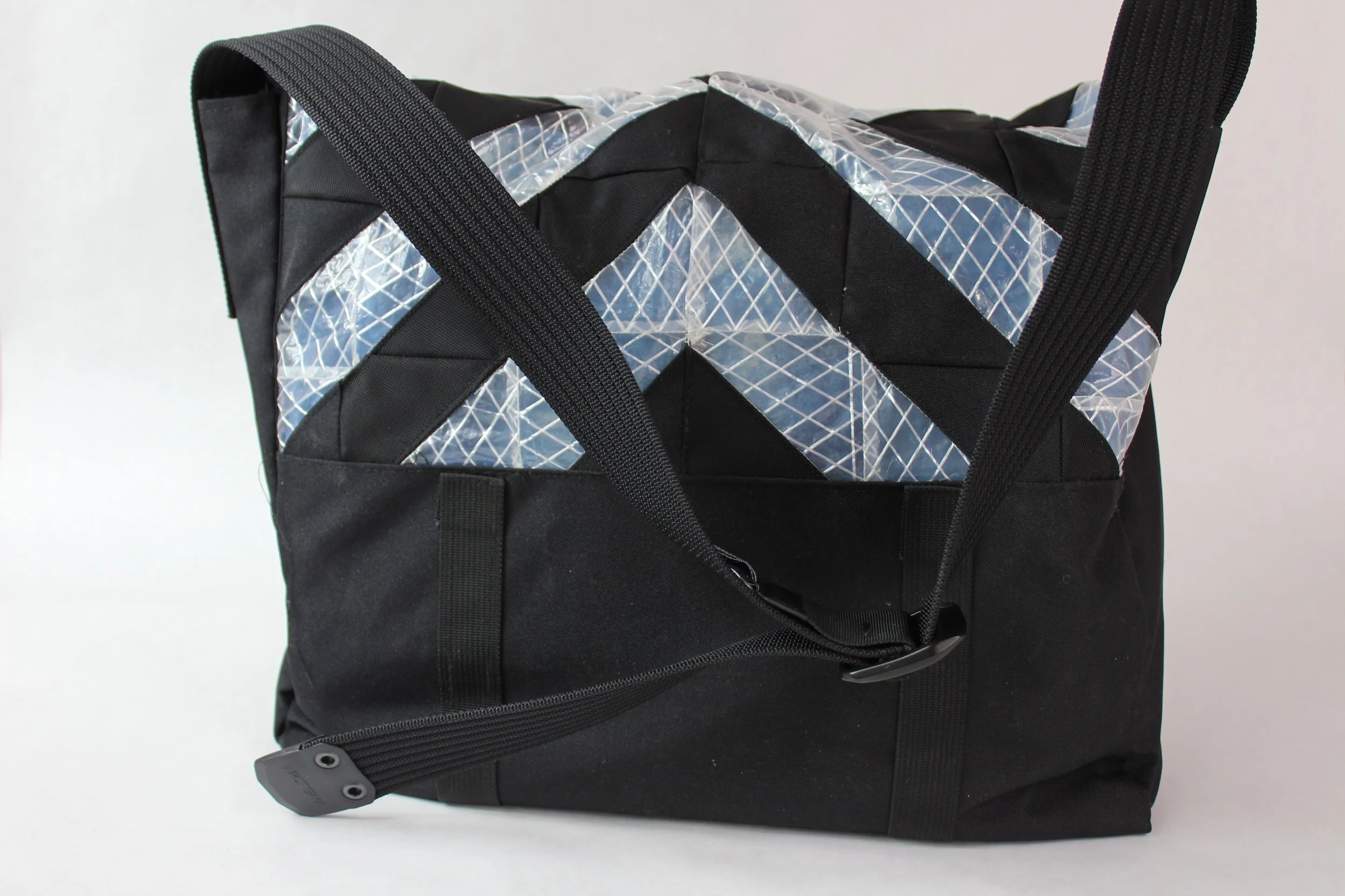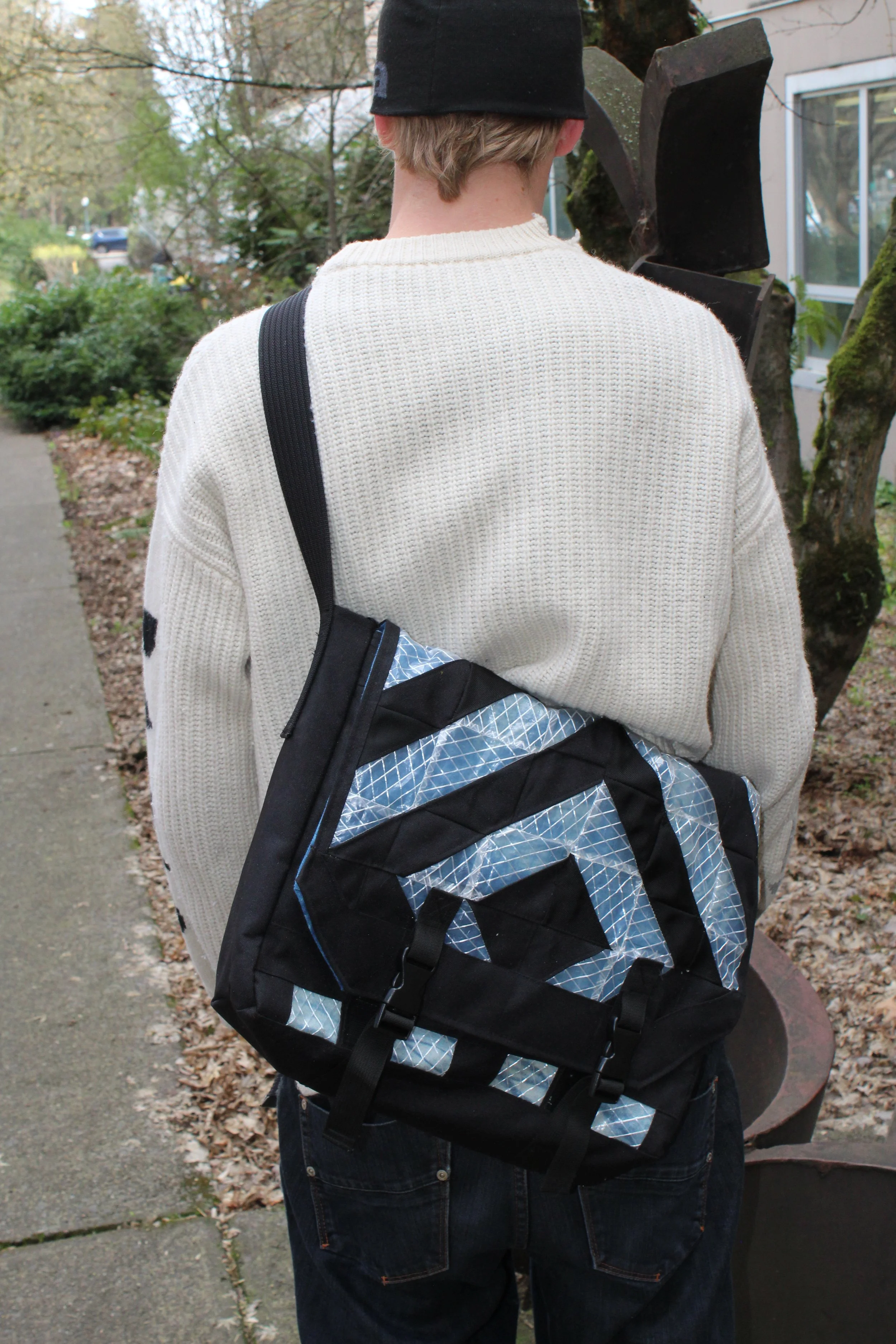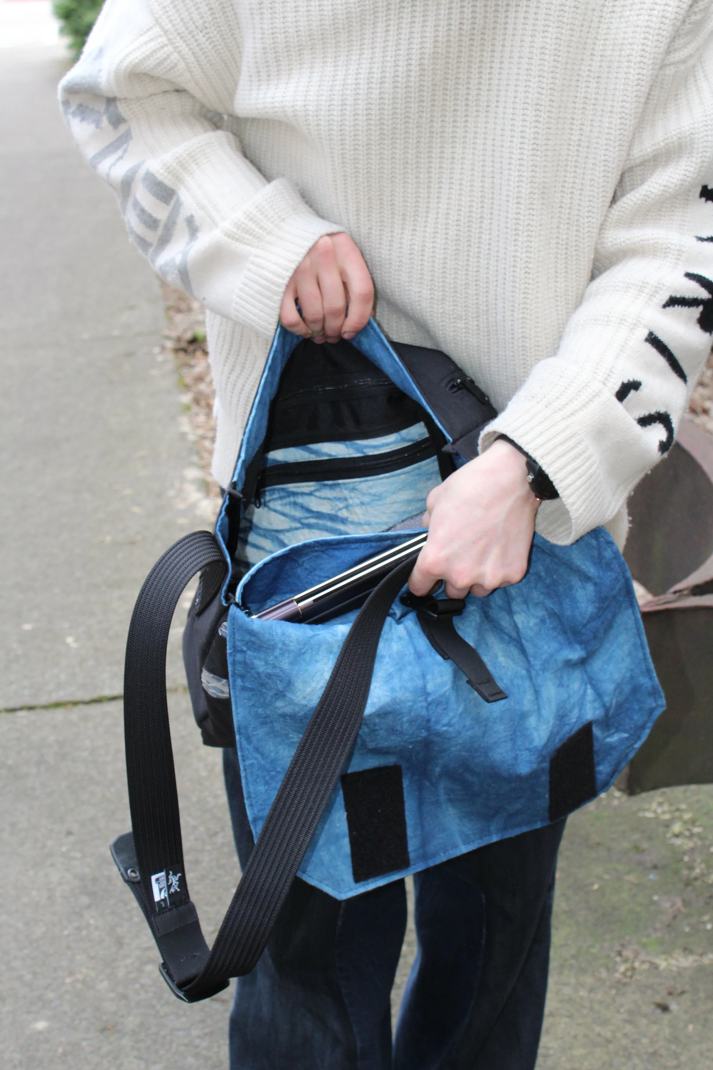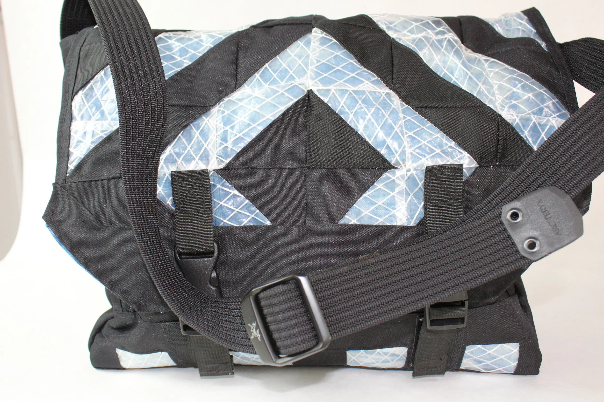 The messenger bag was designed constructed and patterned by hand. Sewn with Cordura and x-pack fabric on the outside the bag has a water resistant construction. The fabrics were patchworked together to create the diamond pattern. The unique clear x-pack allows for a window to the indigo dyed canvas interior. The interior of the bag is lined with the hand dyed indigo canvas giving a unique and subtle abstraction to the interior and its pockets. The heavy canvas and Cordura construction give the bag a high quality and durable construction and feel. Complete with 4 YKK zipper pockets, buckles, Velcro and an adjustable belt strap made from an Arc’teryx belt. The many pockets ease of entry and integrated computer sleeve make this bag perfect for everyday use in any weather.