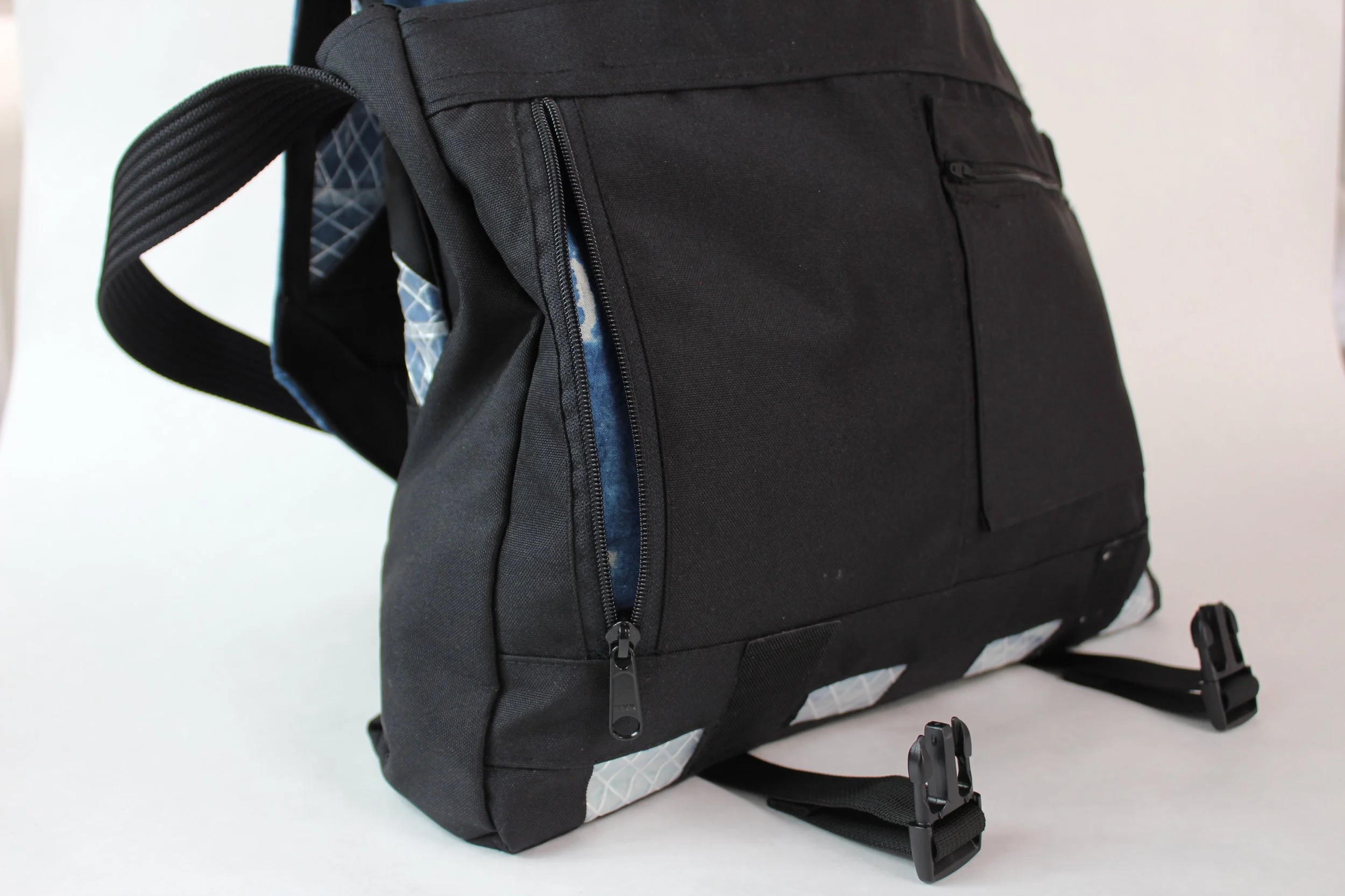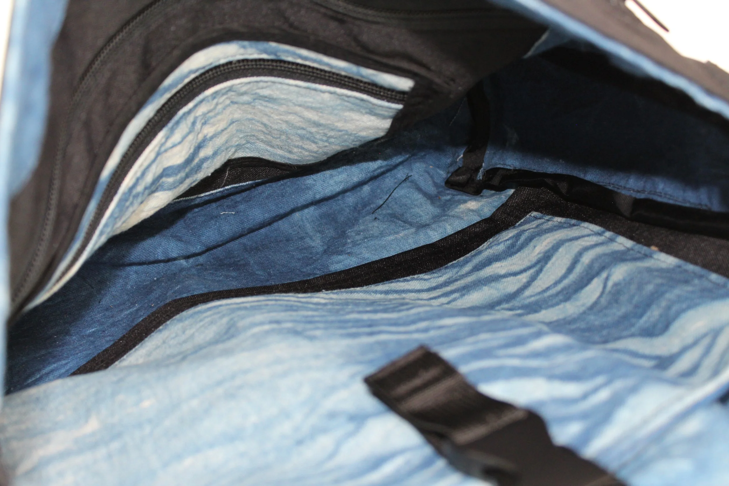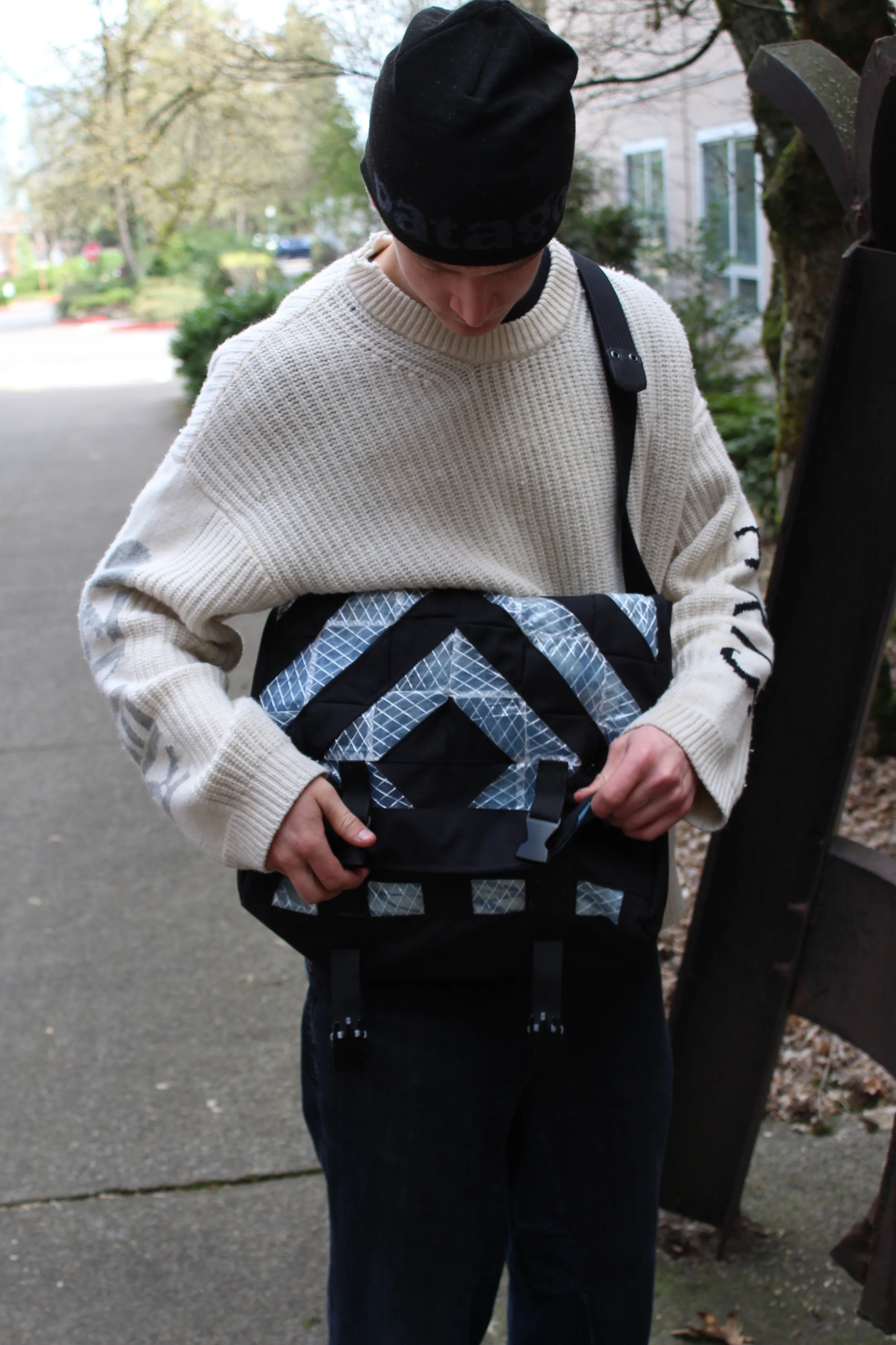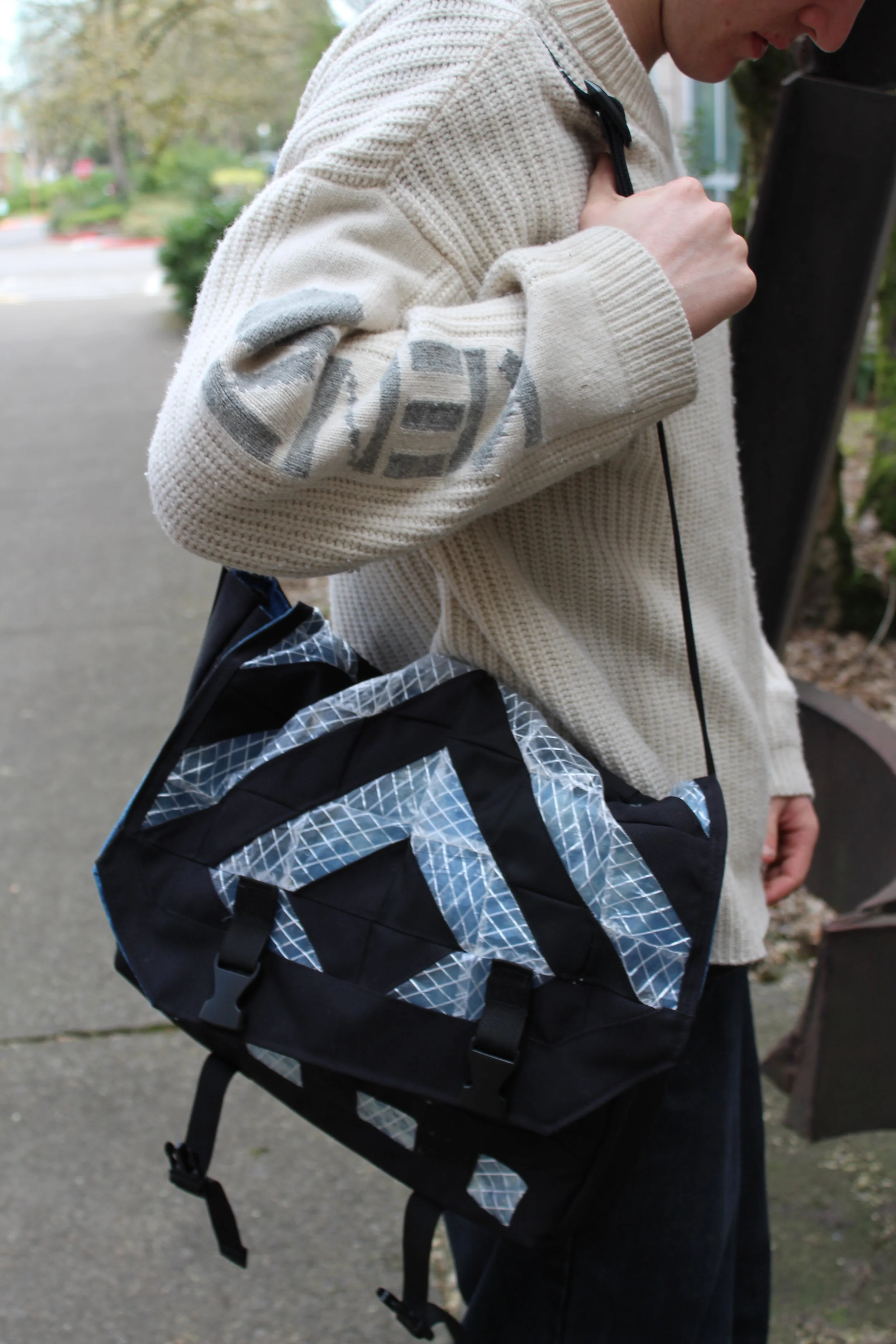 The messenger bag was designed constructed and patterned by hand. Sewn with Cordura and x-pack fabric on the outside the bag has a water resistant construction. The fabrics were patchworked together to create the diamond pattern. The unique clear x-pack allows for a window to the indigo dyed canvas interior. The interior of the bag is lined with the hand dyed indigo canvas giving a unique and subtle abstraction to the interior and its pockets. The heavy canvas and Cordura construction give the bag a high quality and durable construction and feel. Complete with 4 YKK zipper pockets, buckles, Velcro and an adjustable belt strap made from an Arc’teryx belt. The many pockets ease of entry and integrated computer sleeve make this bag perfect for everyday use in any weather.