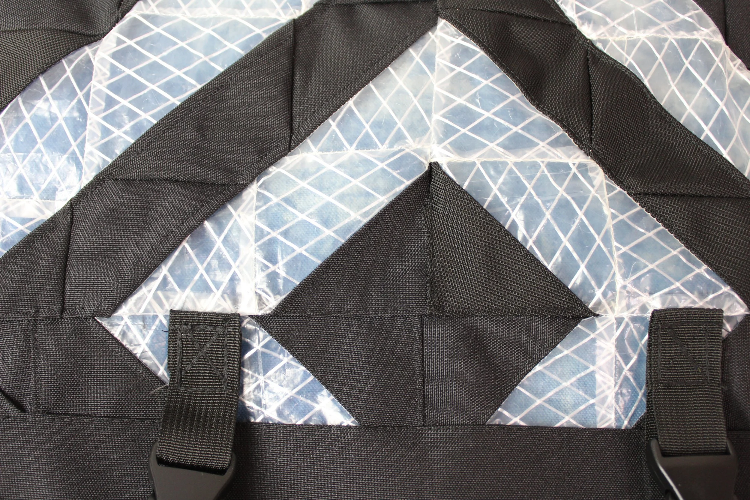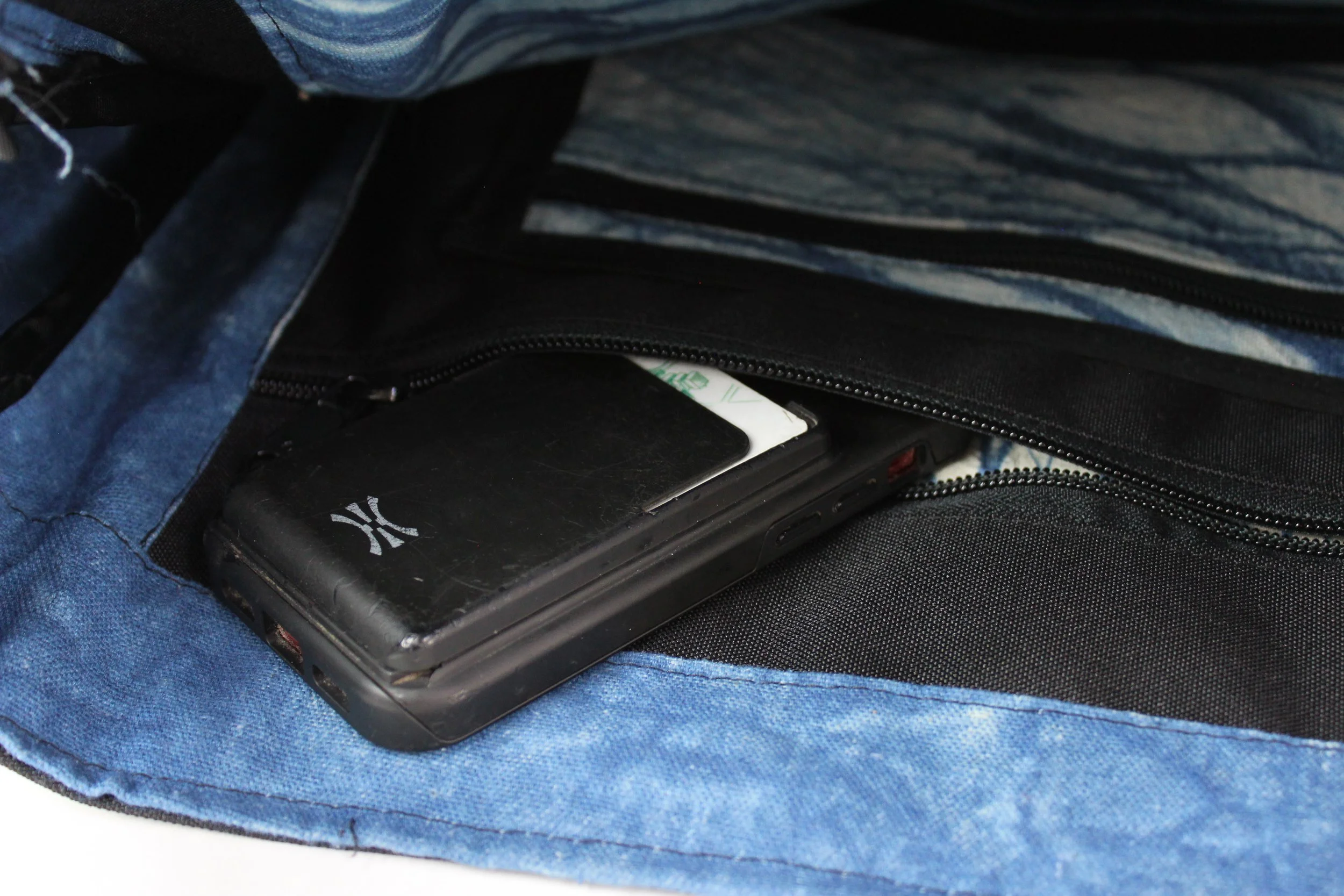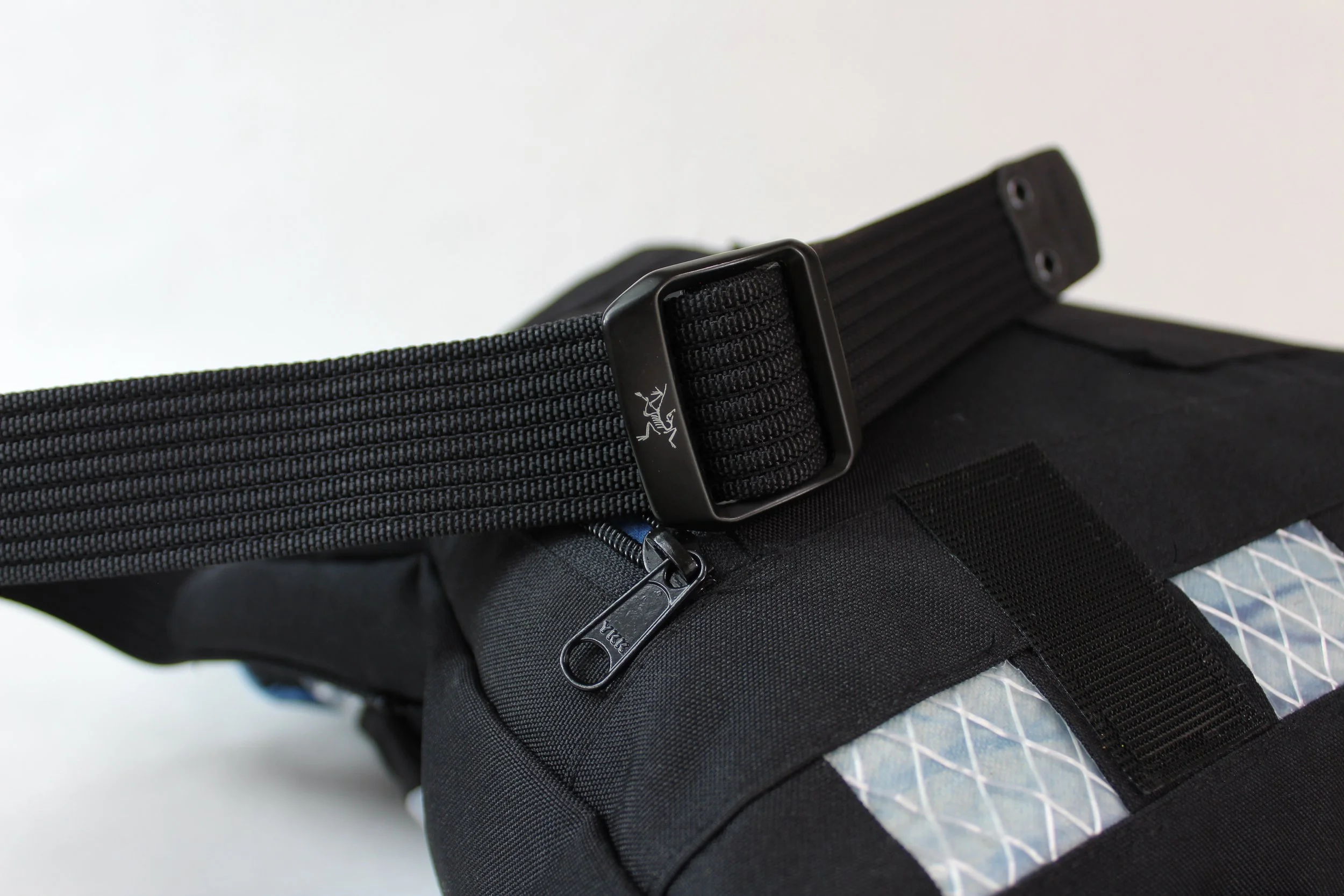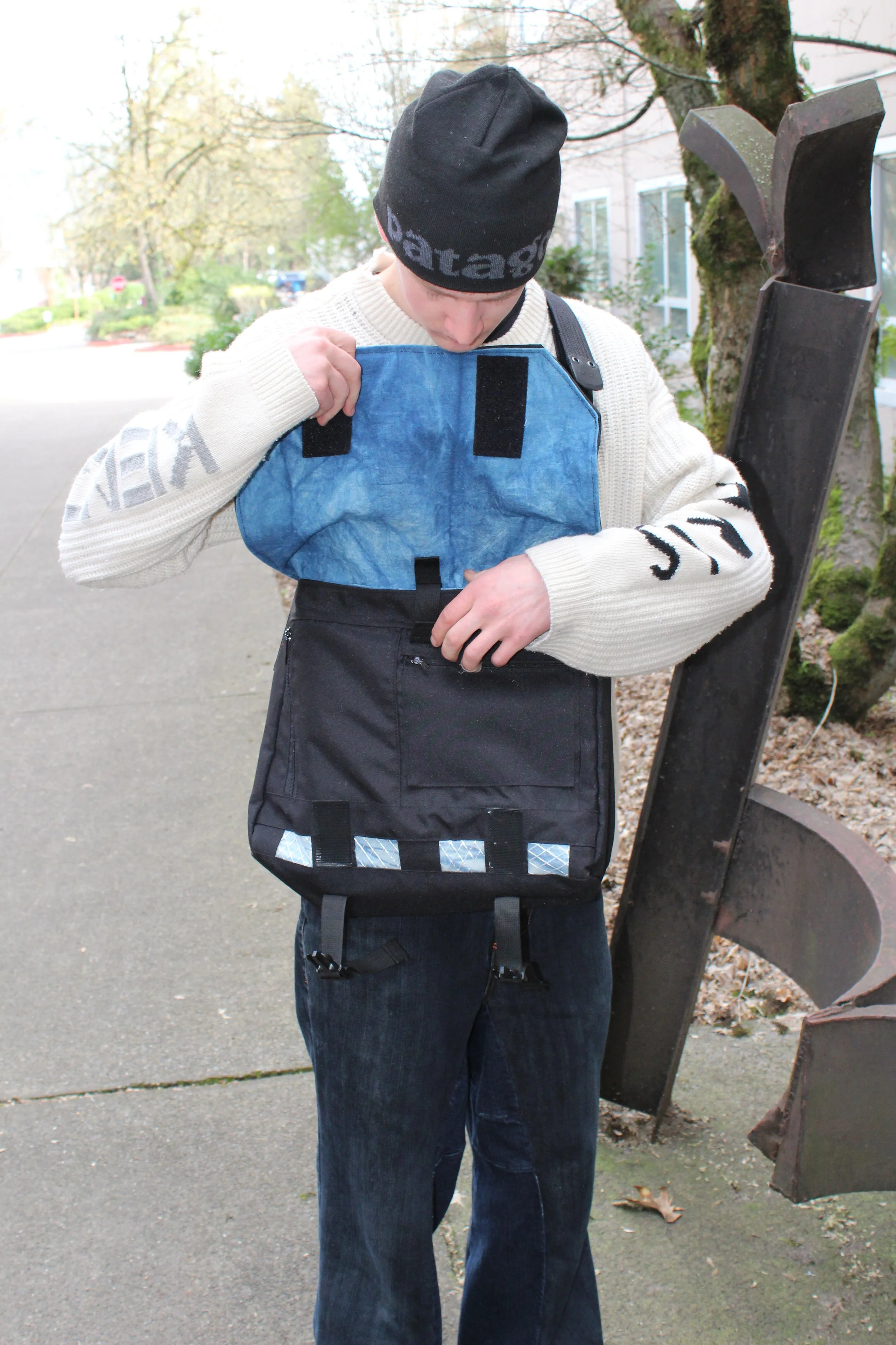The messenger bag was designed constructed and patterned by hand. Sewn with Cordura and x-pack fabric on the outside the bag has a water resistant construction. The fabrics were patchworked together to create the diamond pattern. The unique clear x-pack allows for a window to the indigo dyed canvas interior. The interior of the bag is lined with the hand dyed indigo canvas giving a unique and subtle abstraction to the interior and its pockets. The heavy canvas and Cordura construction give the bag a high quality and durable construction and feel. Complete with 4 YKK zipper pockets, buckles, Velcro and an adjustable belt strap made from an Arc’teryx belt. The many pockets ease of entry and integrated computer sleeve make this bag perfect for everyday use in any weather.